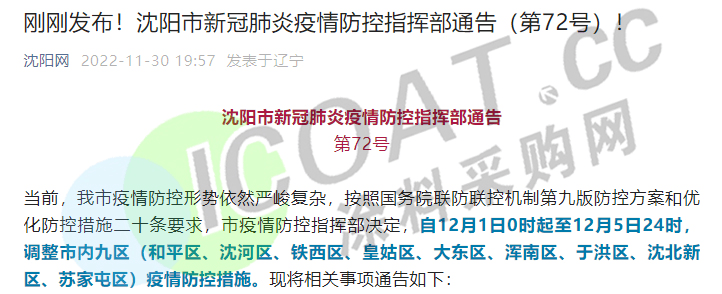 沈陽市自12月1日0時起至12月5日24時,調整市內九區(和平區、沈河區、鐵西區、皇姑區、大東區、渾南區、于洪區、沈北新區、蘇家屯區)疫情防控措施。具體包括:分類實施核酸檢測、有序恢復經營活動等?;謴筒蛷d飯店、景區景點、賓館酒店、農貿市場、影劇院等開放場所,限流50%。