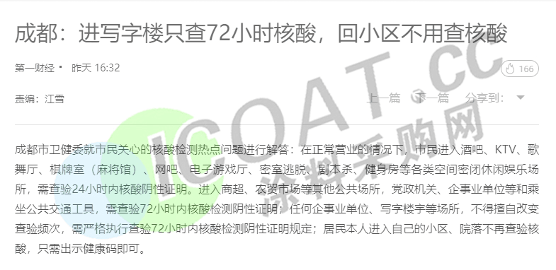 成都采取更為科學精準的防控措施,任何企事業單位、寫字樓宇等場所,不得擅自改變查驗頻次,需嚴格執行查驗72小時內核酸檢測陰性證明規定。居民本人進入自己的小區、院落不再查驗核酸,只需出示健康碼即可。