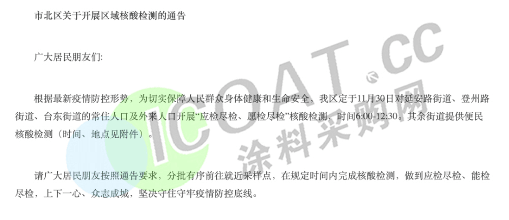 青島市市北區發布《關于開展區域核酸檢測的通告》,只對延安路街道、登州路街道、臺東街道的常住人口及外來人口開展“應檢盡檢、愿檢盡檢”區域核酸檢測,時間6:00-12:30。其余街道提供便民核酸檢測。