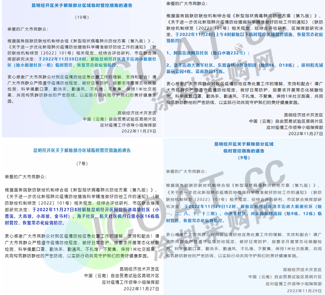 昆明連續多日發布了昆明經開區關于解除部分區域臨時管控措施的通告,解除多個區域臨時管控,恢復常態化疫情防控。