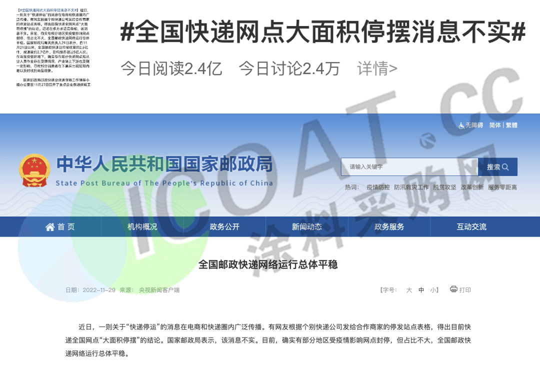 郵政局緊急辟謠在全國上下一片放開防疫過度管控的呼聲之中,網傳“全國快遞停擺”的消息也引發了巨震,不少網友擔心出行受阻的同時,網購的食品物資也難以迅速送達,紛紛表示憂慮。對此,國家郵政局表示,全國快遞網點大面積停擺消息不屬實。雖然有部分地區網點封停,但占比不大。國家郵政局已經發出通知,對于已經關停的郵政快遞基礎設施,滿足解封條件的要盡快有序解封。