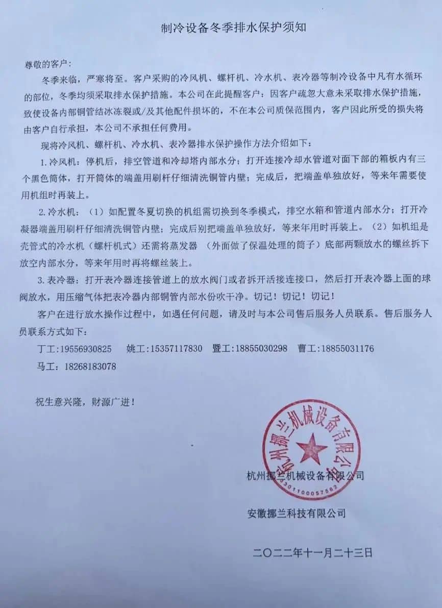 本次特邀訪談緣起于近日,涂料采購網了解到,挪蘭科技相關負責人通過公開渠道向客戶展示出一份函件。這份函件中系統性地整理了有關冷風機、螺桿機、冷水機保護的操作方法。字里行間一再提醒客戶:機械設備凡有水循環的部位,冬季均須采取排水保護措施。未采取排水保護措施,需承擔設備內部銅管結冰凍裂及其他配件損壞的風險。