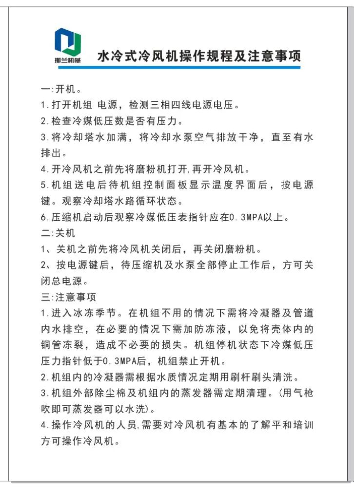冷風機:停機后,排空管道和冷卻塔內部水分打開連接冷卻水管道對面下部的箱板內有三個黑色簡體,打開簡體的端蓋用刷桿仔細清洗銅管內壁。完成后,把端蓋單獨放好,等來年需要使用機組時再裝上。