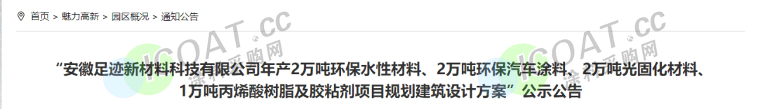 安徽足跡新材料年產(chǎn)2萬噸環(huán)保水性材料、2萬噸環(huán)保汽車涂料、2萬噸光固化材料、1萬噸丙烯酸樹脂及膠粘劑項(xiàng)目規(guī)劃建筑設(shè)計(jì)方案公示公告。