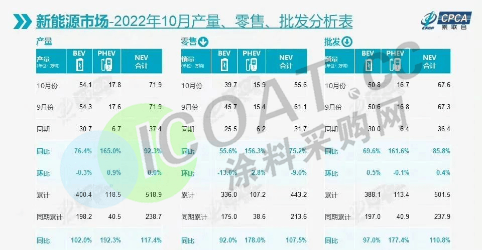 近年來,國內(nèi)新能源汽車的迅猛發(fā)展,讓很多涂料企業(yè)看到了機(jī)會。今年1月至10月,國內(nèi)乘用車市場共銷售1671.6萬輛汽車,同比增長3%;新能源車國內(nèi)銷售443.2萬輛,同比增長107.5%。10月份新能源車的滲透率首次突破30%,銷量達(dá)到55.6萬輛,同比增長75.2%。