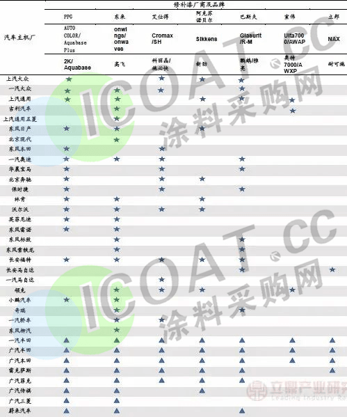 國內(nèi)汽車修補(bǔ)漆方面呈現(xiàn)“5+3+2+1”格局。5家歐美品牌,其中PPG、BASF繼續(xù)收購并購,演化趨勢為3家品牌;3家日本品牌,立邦、關(guān)西、洛克;2家韓國品牌,KCC、NAROO;1家中國品牌,東來“高飛”。