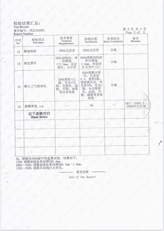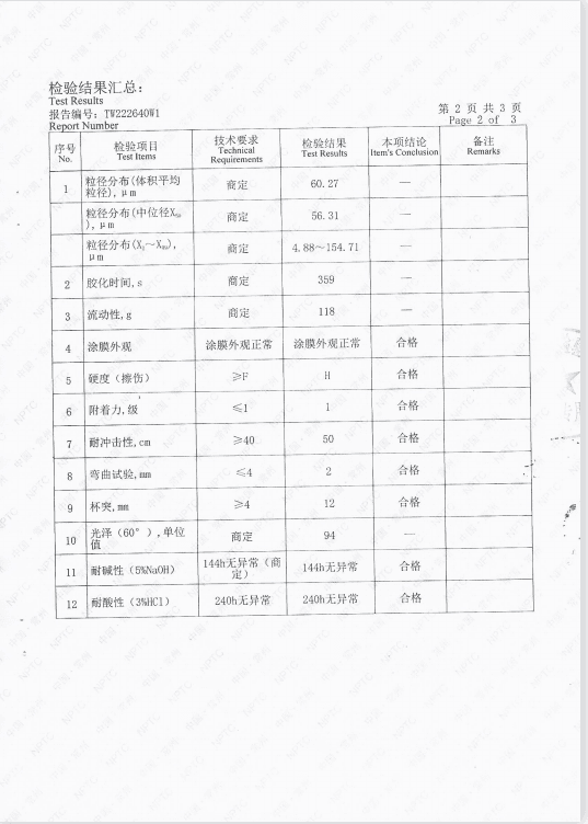值得一提的是,新品RD1031從實驗室走向客戶庫房之前,已憑借優(yōu)異表現(xiàn)通過了水煮保光率、正沖反沖、厚涂針孔、黃變色差、流平性等級等諸多方面的性能測試,具備權(quán)威機(jī)構(gòu)出具的產(chǎn)品質(zhì)量檢測報告,送檢樣品所檢粒徑分布、膠化時間、流動性、附著力等項目符合HG/T 2006-2006熱固性粉末涂料的技術(shù)要求。