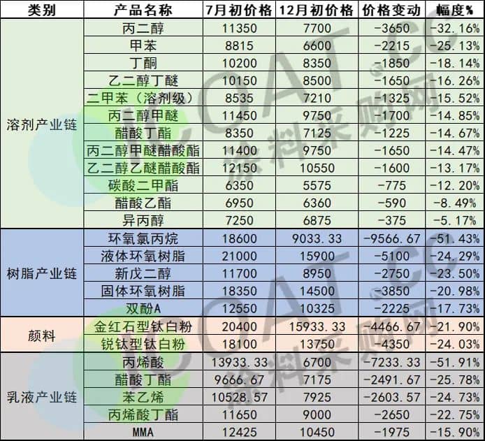 不難發現,無論是涂料產業鏈,還是化工、塑化等多個產業鏈,其上游原料都出現了價格下滑的情況,部分原材料跌幅近7成,價格腰斬者更是不計其數。這些跌價一方面是上游支撐乏力帶來的直接影響,另一方面則是市場需求銳減造成的,年末補貨者較少,剛需更是頻繁減少,賣不出貨自然也就沒有高價。