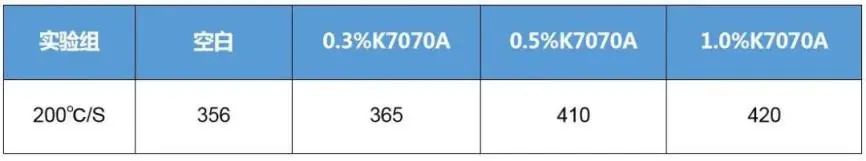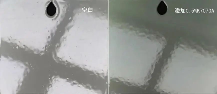 考慮到普通的低成本聚酯在應用過程中容易出現縮孔、針孔,捷通達的研發人員以此類樹脂作為實驗基料考查K7070A的抗縮孔性能。實驗結果顯示,當科研人員把K7070A的添加量0.3%調整為0.5%時,縮孔逐漸消失,表觀效果優異。此外,添加1.0%的K7070A相較于添加等量的光亮劑,縮孔問題可以被完全解決。