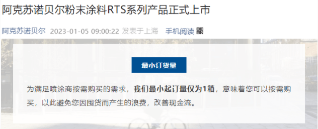 近日,涂料巨頭阿克蘇諾貝爾發(fā)布粉末涂料新品,這次跟以往最大的不同的是,全新系列產(chǎn)品最小起訂量僅為1箱,而且承諾下單后最快3個工作日的交付周期,確保能快速響應(yīng)客戶的緊急需求,減少停線風(fēng)險,這就意味著客戶可以按需購買。