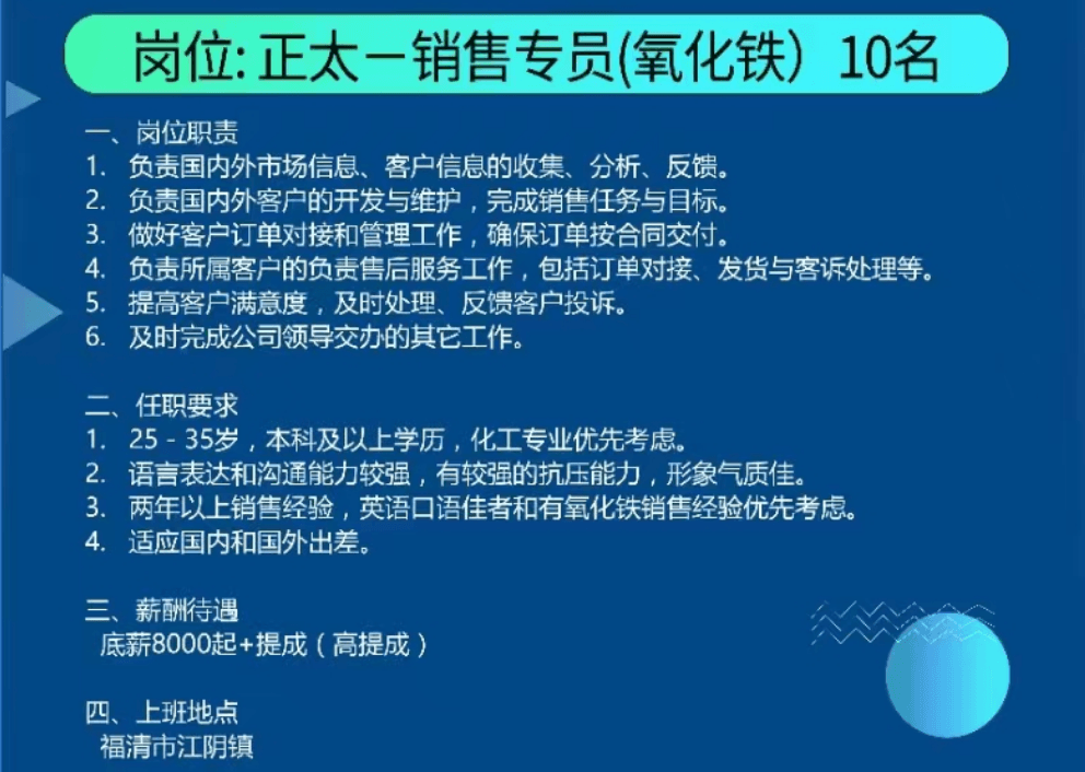 近日,福建坤彩材料科技股份有限公司(上證:603826)發(fā)布招聘啟事,誠(chéng)聘氯化鈦白粉銷售專員10名,氧化鐵銷售專員10名,底薪8000元起,并提供高額提成,待遇優(yōu)渥,歡迎有才之士加盟。