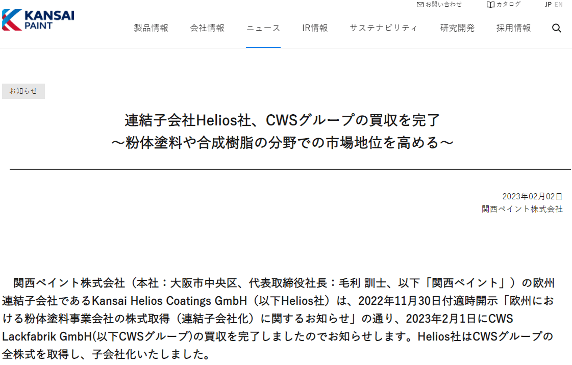該交易于2022年11月30日首次以“關于收購歐洲一家粉末涂料業務公司(使其成為合并子公司)股份的通知”的形式公布。Kansai Helios收購了CWS的所有股份,并成為其新所有者。
