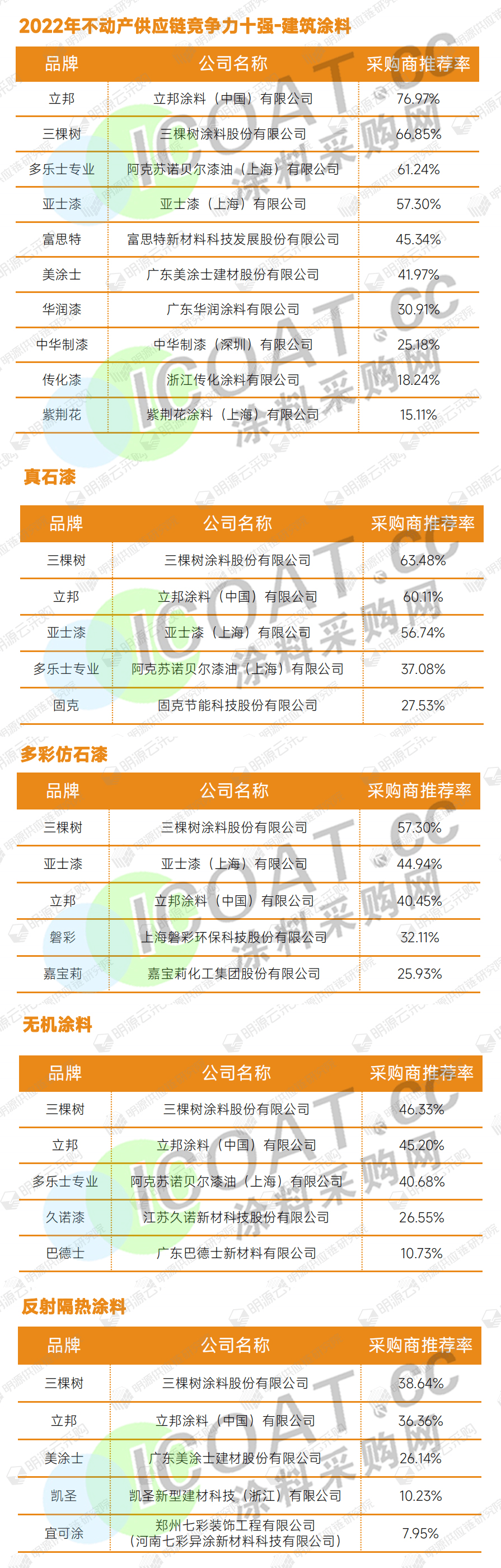 有機構預測,中長期我國建筑涂料市場空間將達到1600多億元,但多方的利好“春風”也無力給所有涂料企業都帶來活力,率先感受到變化的仍舊是品牌、質量和多方面位于領軍地位的涂料企業。明源云采購發布的國內不動產供應鏈競爭力十強企業中的企業,無疑就是表率。這當中覆蓋了多個細分領域,不乏努力自救力求扭轉時局的中外涂料龍頭等。