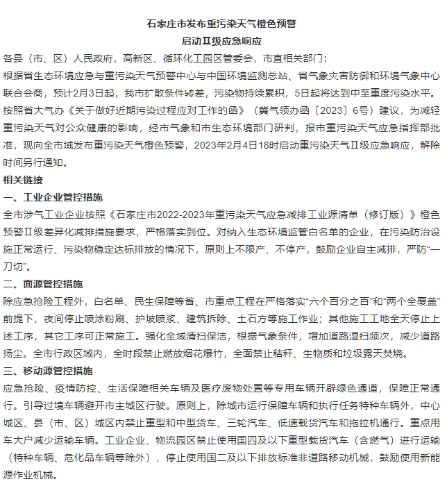 石家莊市重污染天氣應(yīng)急指揮部批準(zhǔn),自2023年2月4日18時(shí)啟動(dòng)重污染天氣Ⅱ級(jí)應(yīng)急響應(yīng),解除時(shí)間另行通知。