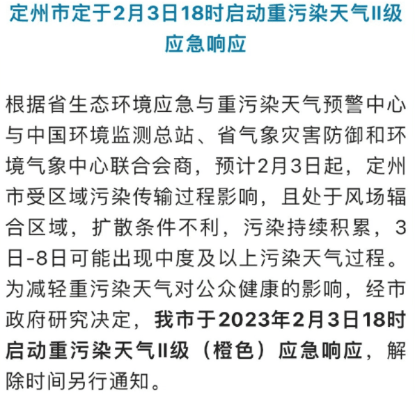 定州市定于2月3日18時(shí)啟動(dòng)重污染天氣Ⅱ級(jí)(橙色)應(yīng)急響應(yīng)。解除時(shí)間另行通知。