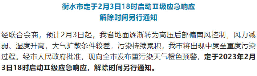 衡水市定于2月3日18時(shí)啟動(dòng)II級(jí)應(yīng)急響應(yīng),解除時(shí)間另行通知。