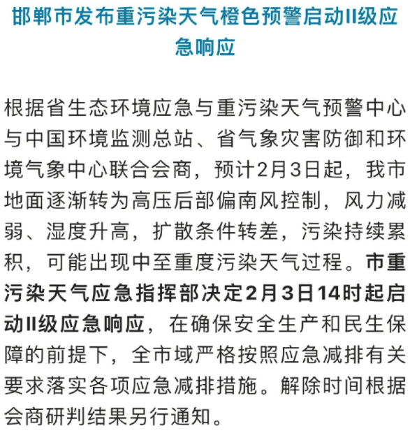 邯鄲市重污染天氣應(yīng)急指揮部決定2月3日14時(shí)起啟動(dòng)II級(jí)應(yīng)急響應(yīng),在確保安全生產(chǎn)和民生保障的前提下,全市域嚴(yán)格按照應(yīng)急減排有關(guān)要求落實(shí)各項(xiàng)應(yīng)急減排措施。解除時(shí)間根據(jù)會(huì)商研判結(jié)果另行通知。