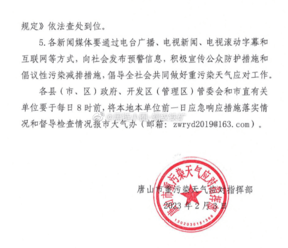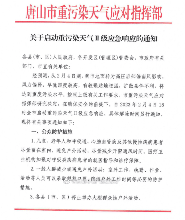 唐山市自2023年2月4日18時(shí)全市啟動(dòng)重污染天氣Ⅱ級(jí)應(yīng)急響應(yīng),具體解除時(shí)間另行通知。