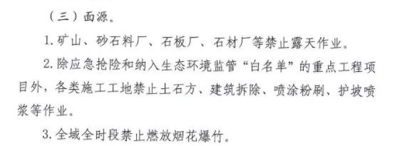 礦山、砂石料廠、石板廠、石材廠等禁止露天作業(yè);除應(yīng)急搶險(xiǎn)和納入生態(tài)環(huán)境監(jiān)管“白名單”的重點(diǎn)工程項(xiàng)目外,各類(lèi)施工工地禁止土石方、建筑拆除、噴涂粉刷、護(hù)坡噴漿等作業(yè);全域全時(shí)段禁止燃放煙花爆竹。