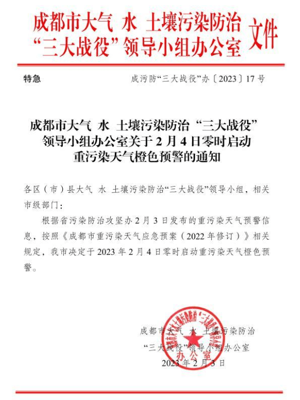 成都市大氣、水、土壤污染防治“三大戰(zhàn)役”領(lǐng)導(dǎo)小組辦公室發(fā)布通知,根據(jù)四川省污染防治攻堅(jiān)辦發(fā)布的重污染天氣預(yù)警信息,按照《成都市重污染天氣應(yīng)急預(yù)案(2022年修訂)》相關(guān)規(guī)定,成都決定于2023年2月4日零時(shí)啟動(dòng)重污染天氣橙色預(yù)警。