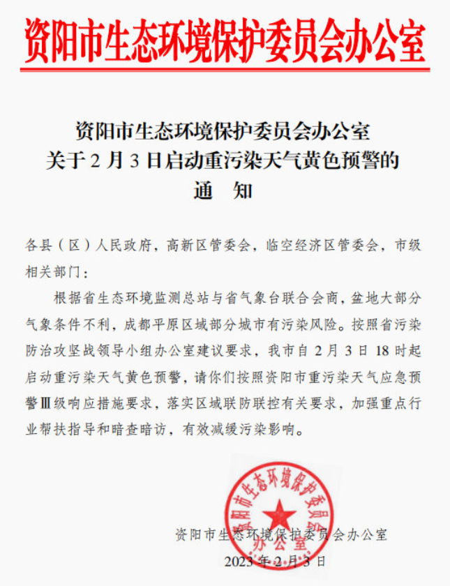 資陽(yáng)市自2月3日18時(shí)起啟動(dòng)重污染天氣黃色預(yù)警,請(qǐng)你們按照資陽(yáng)市重污染天氣應(yīng)急預(yù)警M級(jí)響應(yīng)措施要求,落實(shí)區(qū)域聯(lián)防聯(lián)控有關(guān)要求,加強(qiáng)重點(diǎn)行業(yè)幫扶指導(dǎo)和暗查暗訪,有效減緩污染影響。