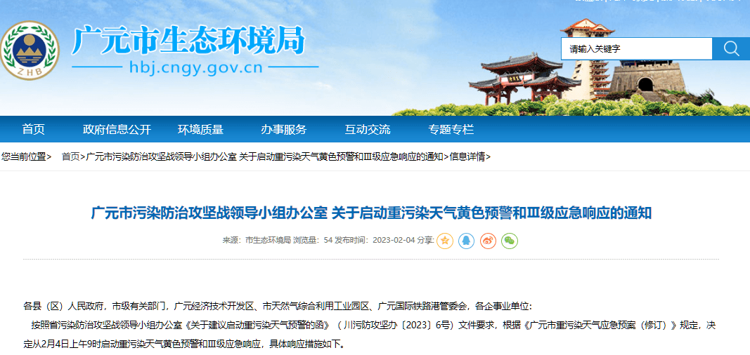 廣元市污染防治攻堅(jiān)戰(zhàn)領(lǐng)導(dǎo)小組辦公室按照省污染防治攻堅(jiān)戰(zhàn)領(lǐng)導(dǎo)小組辦公室決定從2月4日上午9時(shí)啟動(dòng)重污染天氣黃色預(yù)警和Ⅲ級(jí)應(yīng)急響應(yīng)。