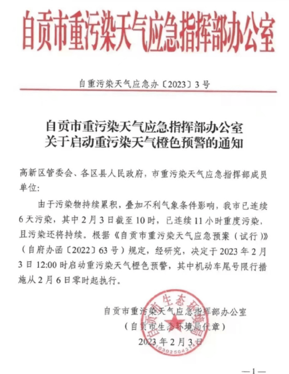 瀘州市污染防治攻堅(jiān)戰(zhàn)領(lǐng)導(dǎo)小組辦公室決定從2023年2月3日12時(shí)起啟動(dòng)重污染天氣Ⅱ級(jí)橙色預(yù)警。