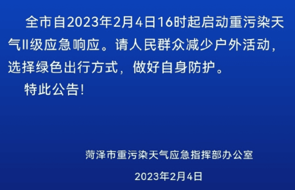菏澤市重污染天氣應(yīng)急指揮部辦公室通知全市自2023年2月4日16時(shí)起啟動(dòng)重污染天氣Ⅱ級(jí)應(yīng)急響應(yīng)。