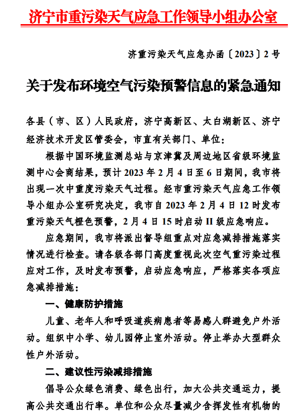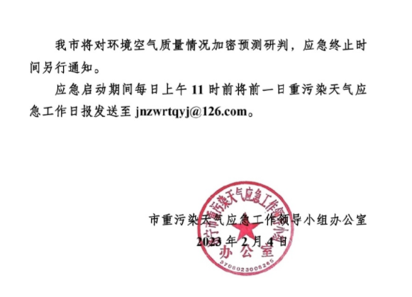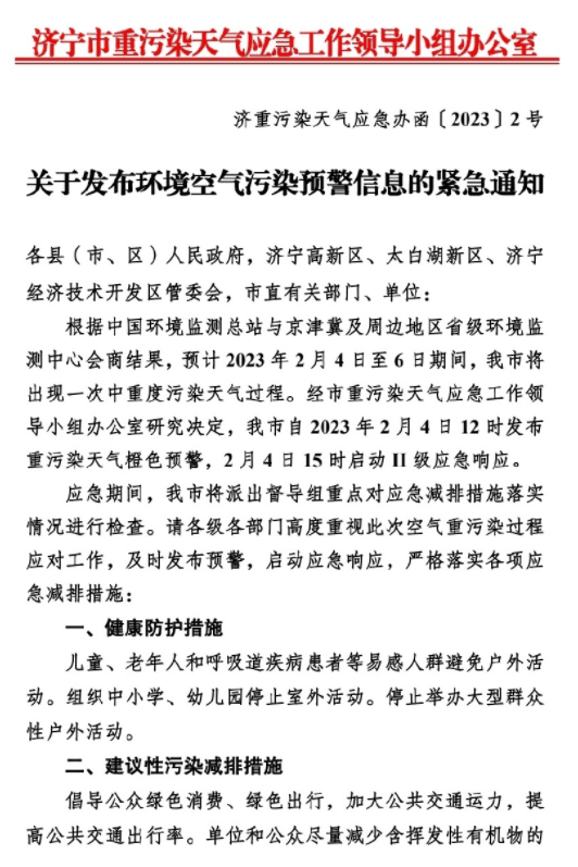 濟(jì)寧市重污染天氣應(yīng)急工作領(lǐng)導(dǎo)小組辦公室研究決定,自2023年2月4日12時(shí)發(fā)布重污染天氣橙色預(yù)警,2月4日15時(shí)啟動(dòng)II級(jí)應(yīng)急響應(yīng)。