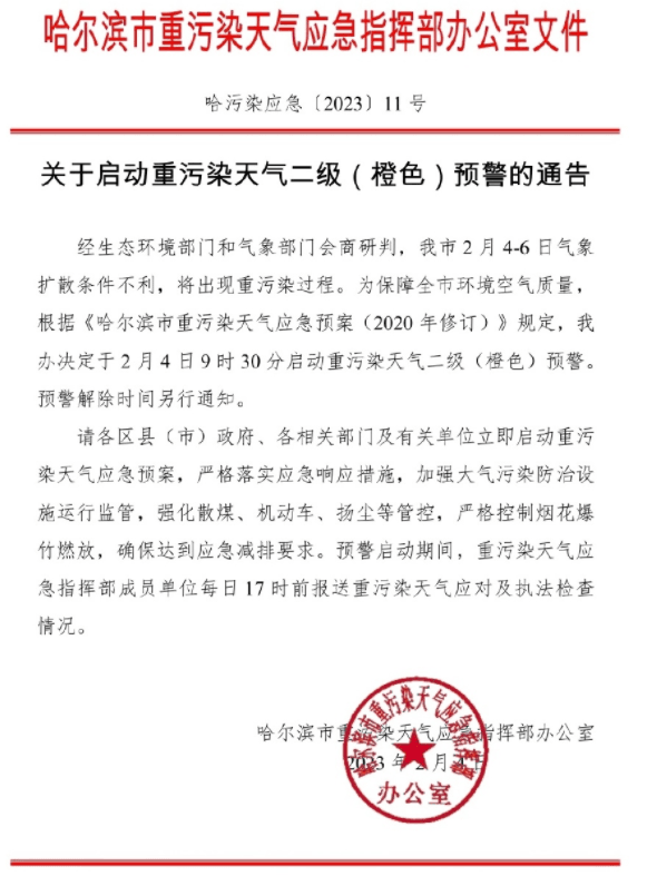 為保障全市環(huán)境空氣質(zhì)量,根據(jù)《哈爾濱市重污染天氣應(yīng)急預(yù)案(2020年修訂)》規(guī)定,哈爾濱市重污染天氣應(yīng)急指揮部辦公室決定于2月4日9時(shí)30分啟動(dòng)重污染天氣二級(jí)(橙色)預(yù)警,預(yù)警解除時(shí)間另行通知。