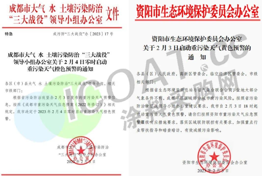 四川:成都、瀘州兩市啟動重污染天氣橙色預警,資陽、德陽、廣元、綿陽、南充、自貢、綿陽7市啟動重污染天氣黃色預警。
