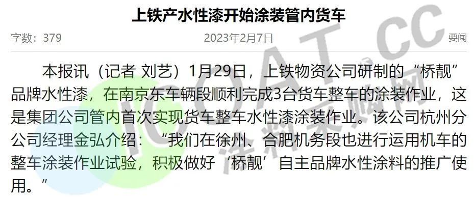 上鐵物資公司杭州分公司精心研制“橋靚”牌環保型水性涂料,在南京東車輛段順利完成3臺貨車整車的涂裝作業,這是集團公司管內首次實現貨車整車水性漆涂裝作業。