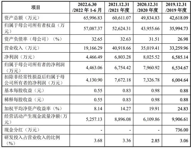 2019年、2020年、2021年和2022年上半年,凌瑋科技的營收分別為3.33億元、3.50億元、4.09億元和1.92億元;凈利潤分別為6585.14萬元、8025.52萬元、6803.28萬元和4466.49萬元,扣非后凈利潤分別為6004.64萬元、7326.78萬元、7672.18萬元和4130.90萬元。