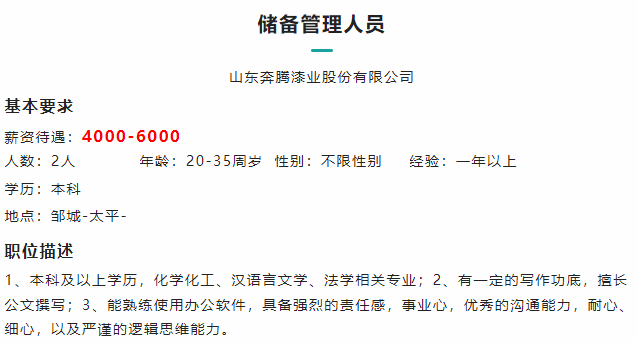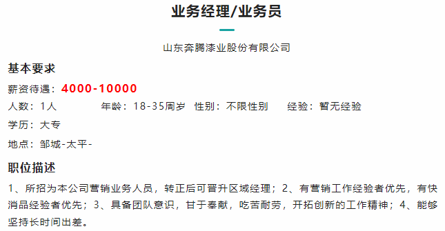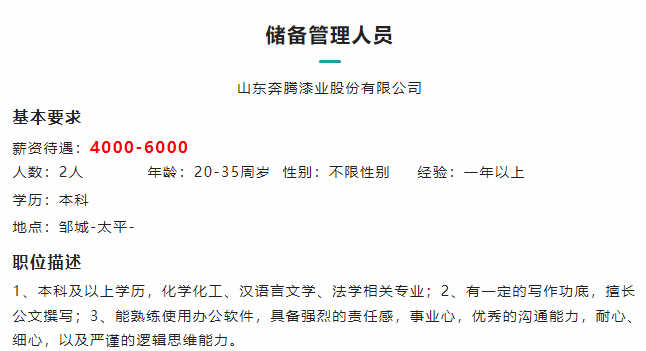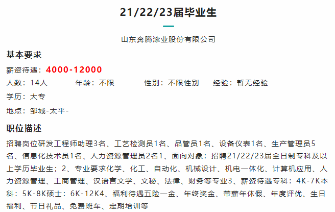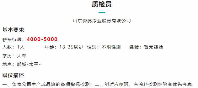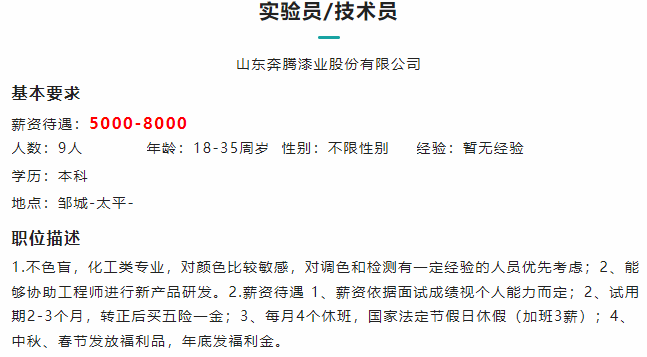 山東奔騰漆業(yè)股份有限公司:月薪12K