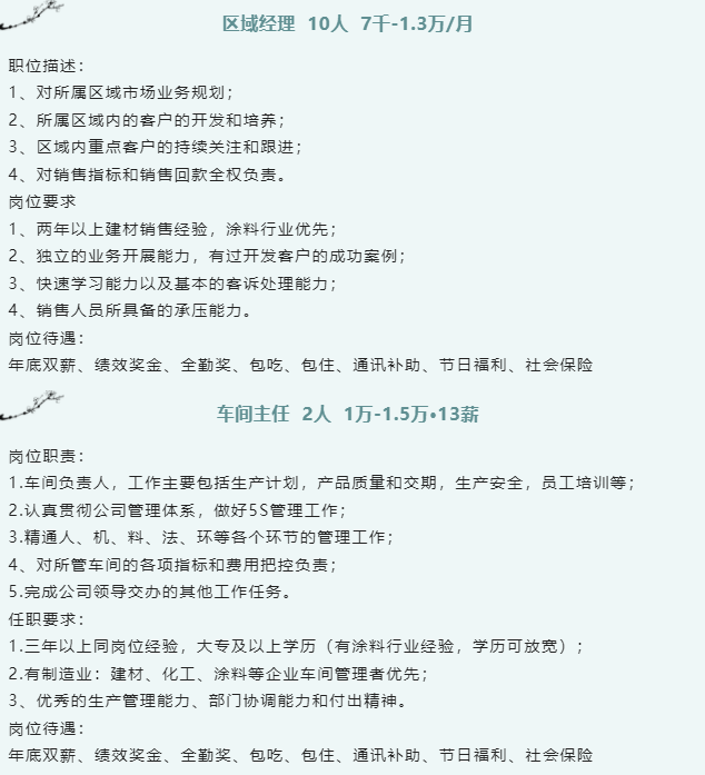 其次,在經(jīng)歷了3年疫情的封控之后,涂料企業(yè)正在奪回屬于自己的市場,年初以來,不少企業(yè)老板親自上陣去穩(wěn)定老客戶,去擴(kuò)展新市場,甚至大手筆投資在江浙滬等華南區(qū)域和珠三角、長三角區(qū)域建設(shè)項(xiàng)目,這就需要有經(jīng)驗(yàn)且有能力的“熟手”加盟管理,因此在項(xiàng)目所在地的大量擴(kuò)招也是必不可少的。