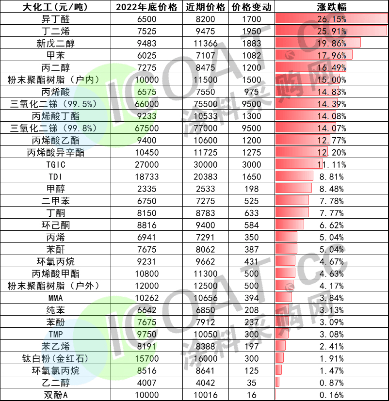而在龍頭企業(yè)的“狂飆”節(jié)奏之下,30多種原材料年內(nèi)出現(xiàn)上漲趨勢(shì)。涂料產(chǎn)業(yè)鏈上游的異丁醛、新戊二醇、聚酯樹脂、TGIC等也出現(xiàn)了不同幅度的價(jià)格上漲。