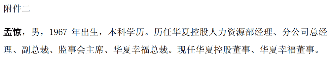 孟驚曾任華夏控股人力資源部經(jīng)理、分公司總經(jīng)理,2013年任副總裁,到2014年升任為總裁。