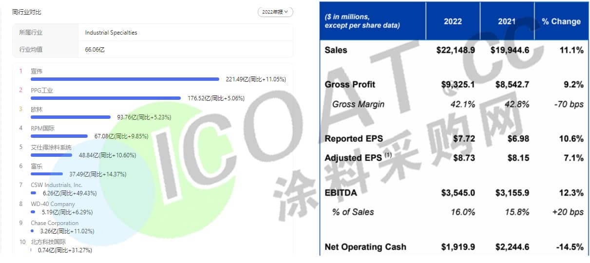 作為美國規模最大、門類最全的專業涂料商和全球涂料工業的領導者。近日,宣偉涂料公布的2022財務業績報告顯示:全年實現凈銷售額為221.49億美元(約合人民幣1495億元),同比增長11.1%。凈利潤為20.201億美元,同比增長8.35%。