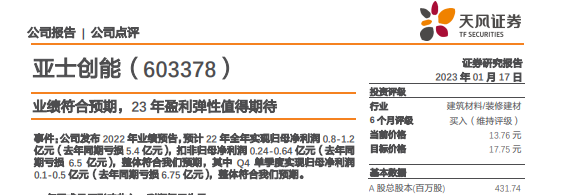 在經歷2021年的首虧后,2022年亞士創能扭虧為盈。據天風證券信息,2023年亞士創能盈利彈性值得期待。