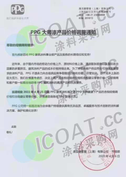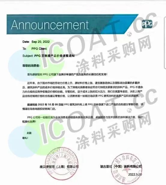 去年9月份,PPG發布了兩張調價函,稱10月8日起,PPG建筑涂料將上調PPG大師漆和PPG芬琳漆旗下進口產品的含稅建議零售價格。