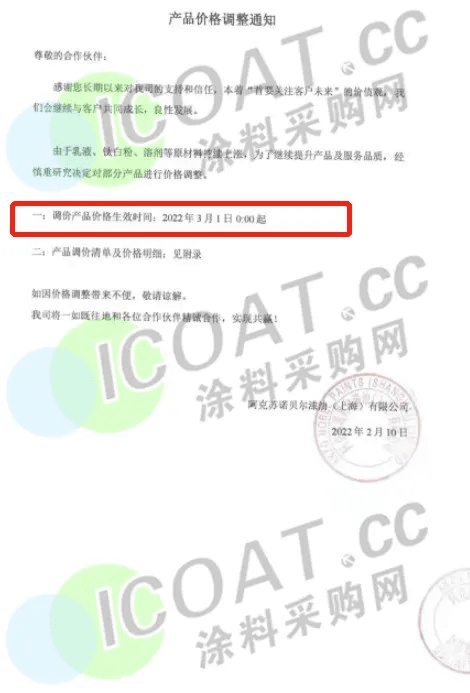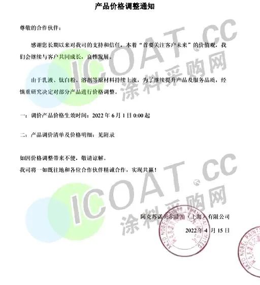 受原材料、運費成本通脹以及市場需求疲軟的影響,2022年阿克蘇諾貝爾多次宣漲。2月,阿克蘇諾貝爾宣布,3月1日0:00起,對部分產品進行價格調整;4月份再發漲價通知,對部分產品進行價格調整,產品調價自6月1日0:00起生效。