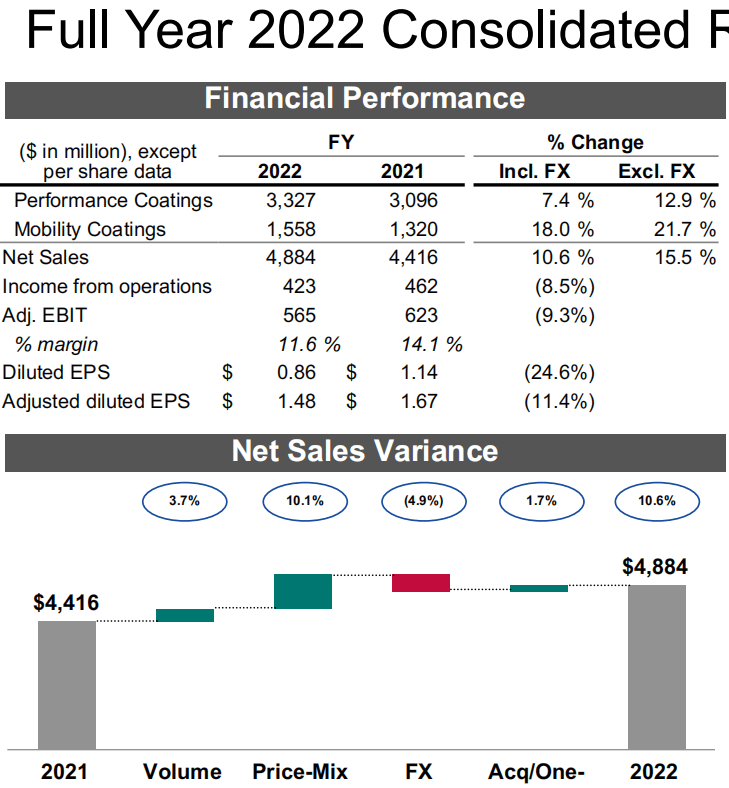 艾仕得預計2022年度全年凈銷售額同比增長10.6%至48.844億元。強勁的同比增長是由提價帶動10.1%,銷量增長帶動3.7%,收購業務拉升1.7%實現的。