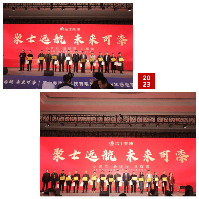 在致辭中,趙董事工表示:經(jīng)過23年的拼搏,潔士美已然成為一家集水性涂料研發(fā)、生產(chǎn)、銷售、服務(wù)為一體的國家級高新技術(shù)企業(yè)。連續(xù)多年獲得墻面漆十大品牌,2022年獲得水性涂料金漆獎。位居全國建筑涂料企業(yè)100強(qiáng)第37位;工程涂料企業(yè)30強(qiáng)第20位。