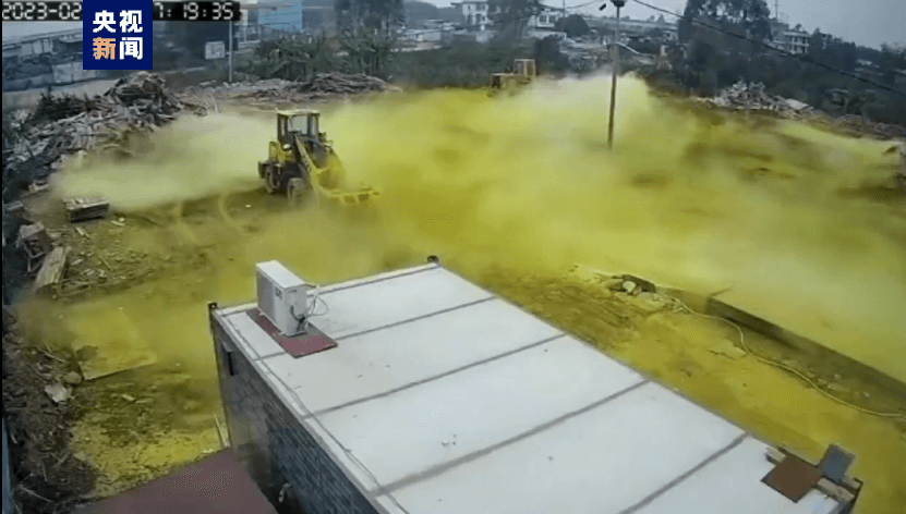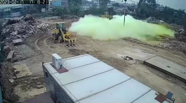 網傳視頻顯示,2月17日17時18分在一塊堆放木材、鉤機等物件的露天場地上,一人正在較遠處位置走動。17時19分,男子走向角落處的一瓶氣罐,手動操作一番后,氣罐突然有大量淡黃色的氣體涌出,并快速向周圍蔓延,僅30秒左右,氣體將整片空地覆蓋,且顏色由淡黃色變為黃綠色。男子見狀,快步逃離現場,不久后倒地不起。