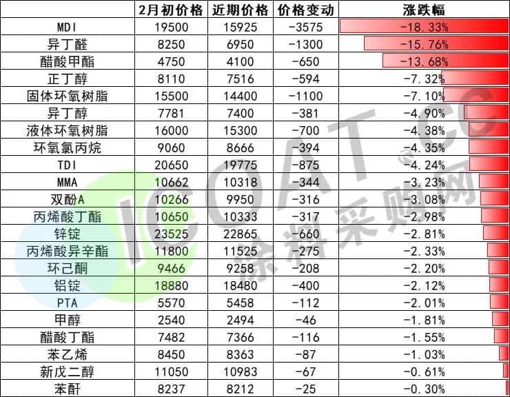 上游PTA原料2月以來報價下跌約100元/噸,新戊二醇報價下跌67元/噸。其中新戊二醇自2月初以來先漲后跌,近期在一周內下跌了近400元/噸,與今年年初1個多月漲了2500元/噸的迅猛形成了鮮明對比。新戊二醇上游重要的原材料異丁醛2月以來價格下跌了1300元/噸,跌幅15.76%。