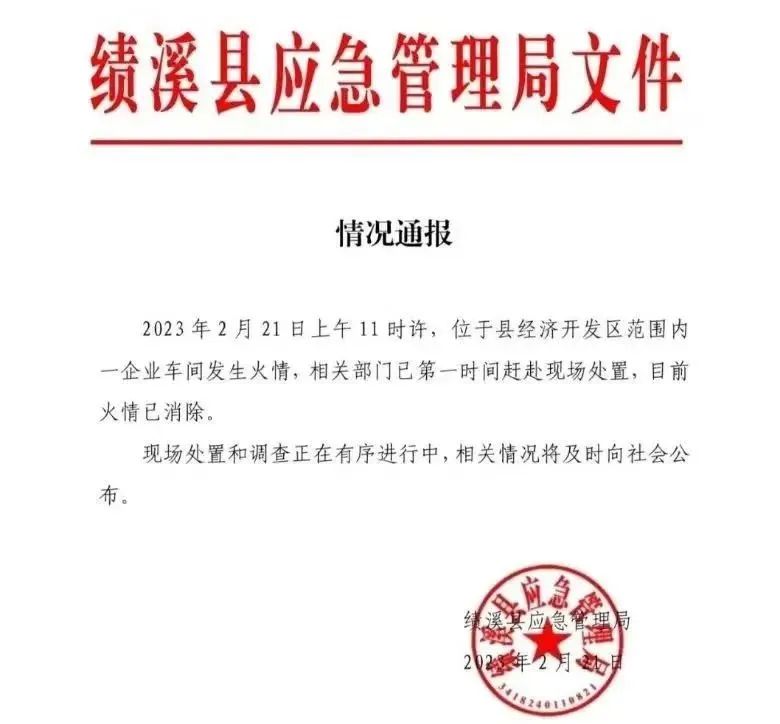 2月21日,安徽宣城市績溪縣祥云路附近一化工廠起火。據傳出的畫面顯示,現場黑煙滾滾。當地生態環境分局一名工作人員稱,起火點系一家殺蟲劑生產工廠,主營業務是殺蟲劑原藥的稀釋和罐裝,現場處置和調查正在有序進行中。