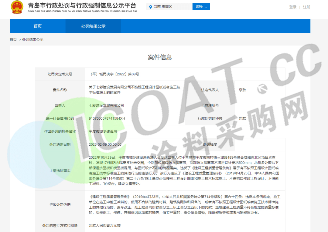 青島市公示了關于“七彩建設發展有限公司(山東七彩涂料工程有限公司)不按照工程設計圖紙或者施工技術標準施工”的案件信息,平度市城鄉建設局給予七彩建設發展有限公司罰款人民幣壹萬元整的行政處罰。