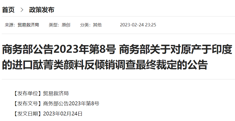對原產于印度的進口酞菁類顏料征收反傾銷稅的實施期限自2023年2月27日起5年。