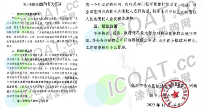 繼去年11月中旬晨陽領(lǐng)導(dǎo)小組辦公室發(fā)布了《關(guān)于晨陽問題的有關(guān)答復(fù)》(點擊查看詳情),并公布“初定1月中旬正式向債權(quán)人發(fā)送債權(quán)人會議相關(guān)通知”的消息后,數(shù)千債權(quán)人一直在關(guān)注相關(guān)信息。有不少人質(zhì)疑,1月中旬正值小年前后,大家忙著張羅過年的事情,是不是會把這件事情延期。