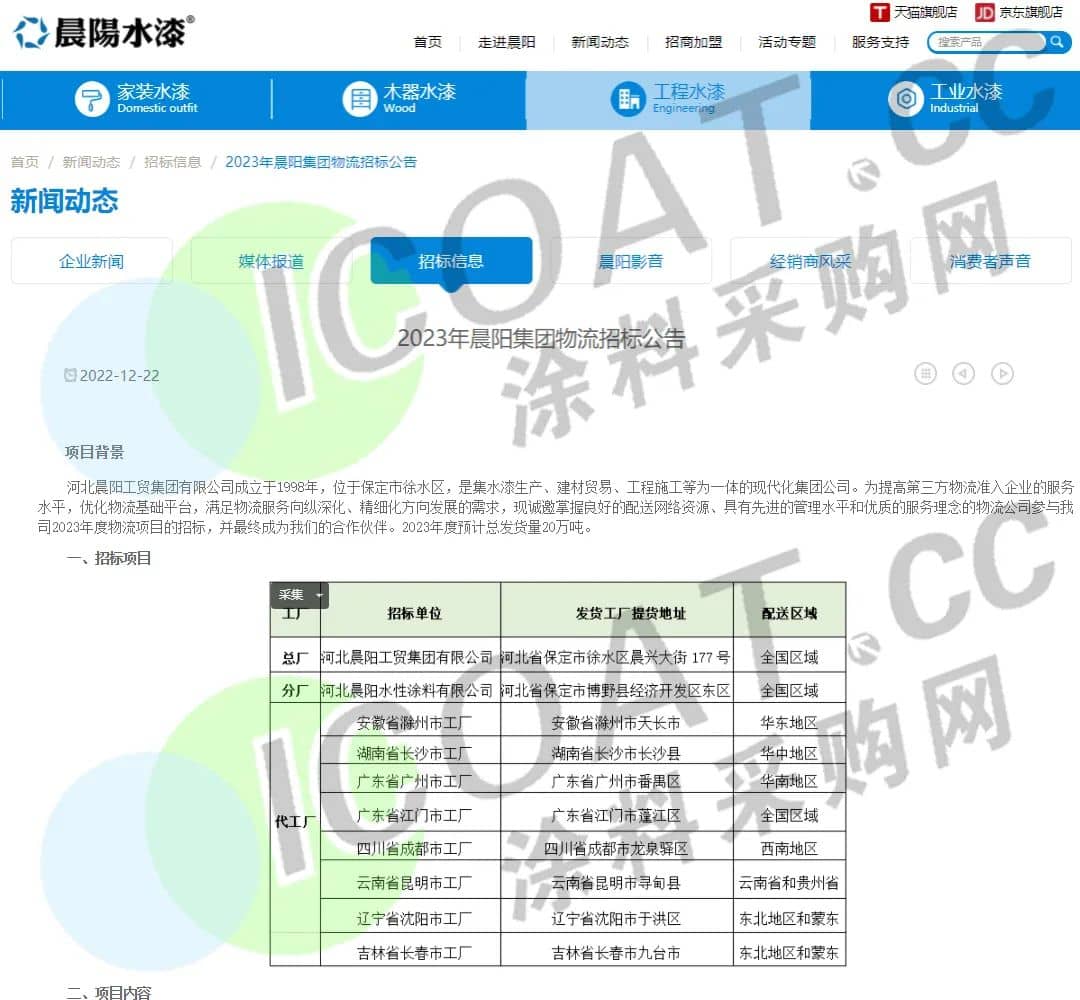 涂料采購網(wǎng)注意到,晨陽水漆官網(wǎng)上近期發(fā)布了2023年晨陽集團物流招標公告,誠邀掌握良好的配送網(wǎng)絡(luò)資源、具有先進的管理水平和優(yōu)質(zhì)的服務(wù)理念的物流公司參與2023年度物流項目的招標,并最終成為合作伙伴,2023年度預(yù)計總發(fā)貨量20萬噸。